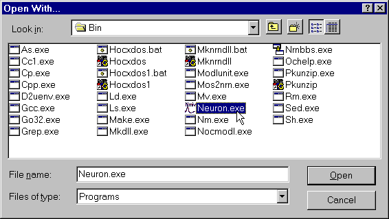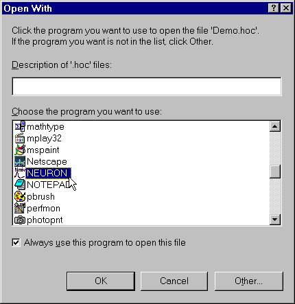 Installing NEURON creates a program group with a few icons, like the one that launches the demo program to show off some of NEURON's capabilities. But sooner or later you're going to want to be able to run NEURON simply by double-clicking on the name of a hoc file in the file manager. Here's a step-by-step guide to help you get this right the first time, with tips for what to do if somehow things didn't go right the first time.