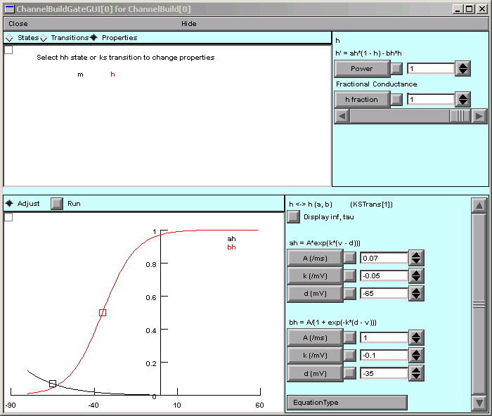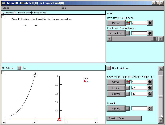 - Clicking on the "Display inf,tau" checkbox toggles the graph between plots of am and bm and plots of the voltage dependence of infm (steady state of m) and taum.