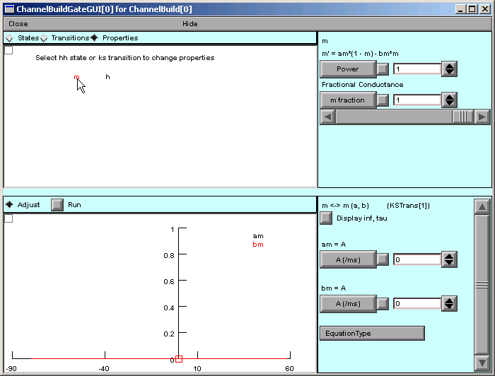 - Clicking on the "Display inf,tau" checkbox toggles the graph between plots of am and bm and plots of the voltage dependence of infm (steady state of m) and taum.